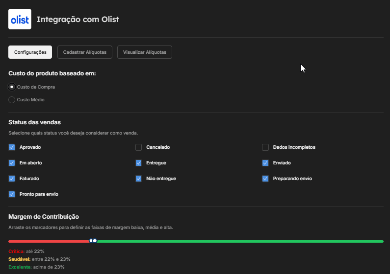 Assim, se você cadastrar uma alíquota apenas no mês atual, as vendas anteriores que forem puxadas para a plataforma *estarão com o valor errado dos custos e margens de contribuição.*