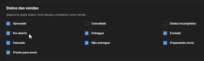 Essa configuração define *quais status o sistema vai entender como venda efetiva*. O ideal é marcar *apenas os status que representam pedidos confirmados,* para evitar distorção nos relatórios.