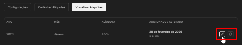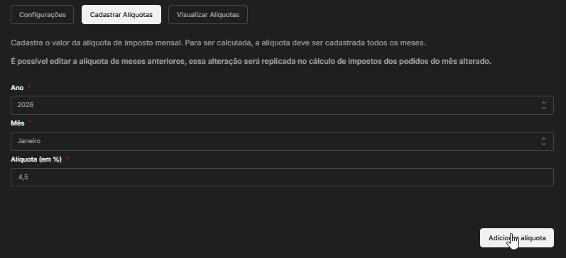 - A alíquota é o *imposto sobre o seu faturamento.* Você pode adicionar a alíquota *mês a mês* ou pode adicionar apenas uma e ela será aplicada durante *todo o período.*
